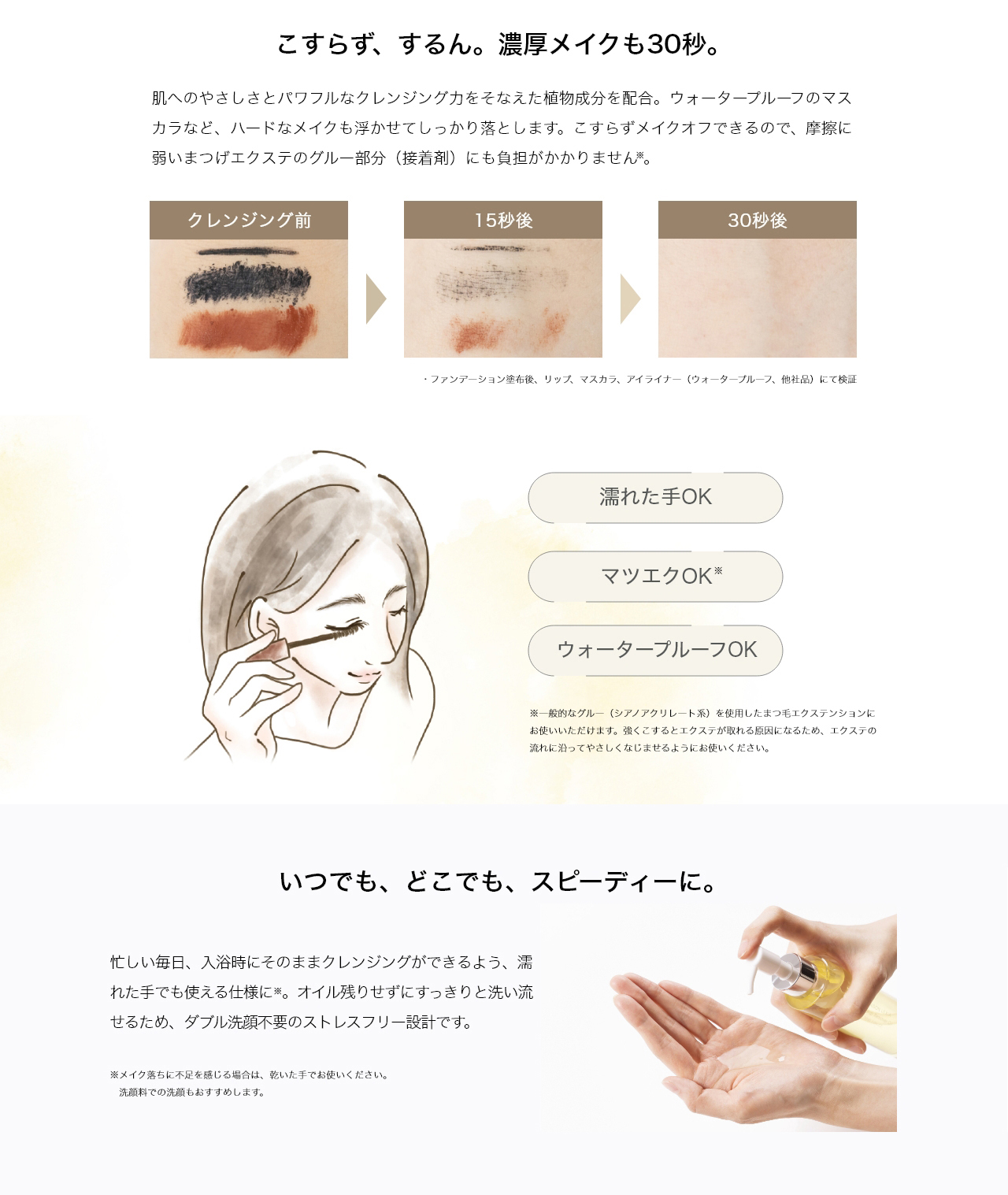 ●濡れた手、まつエク※、ウォータープルーフのすべてがOK。さらに鉱物油・シリコーンオイル不使用。毎日ストレスなくお使いいただけます。